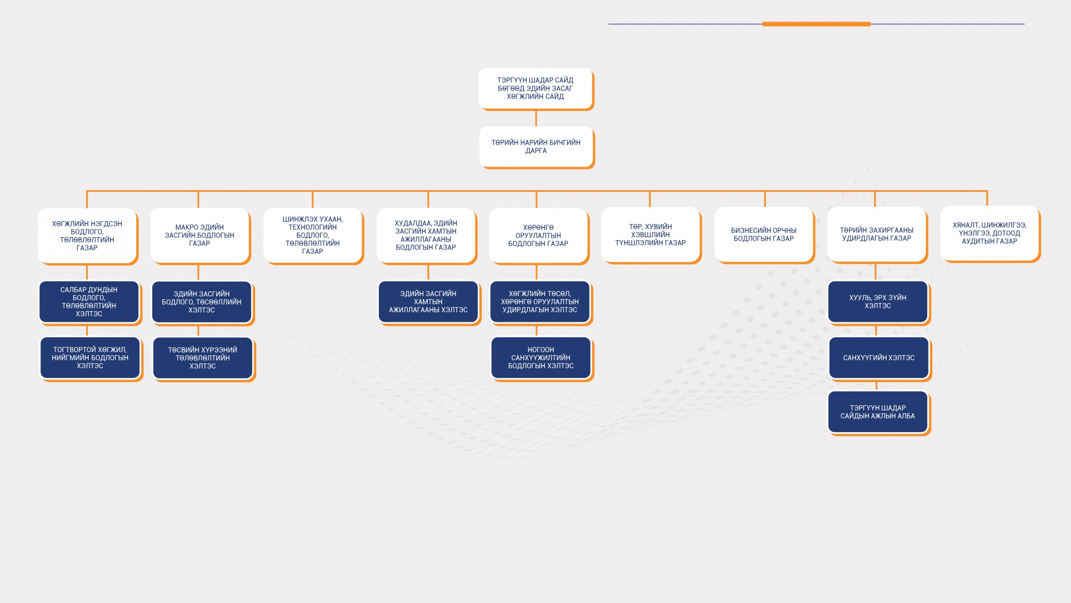 Энэ нэгжийн чиг үүргийн хүрээнд Хууль, эрх зүйн нэгж болон Санхүүгийн нэгж ажиллана: